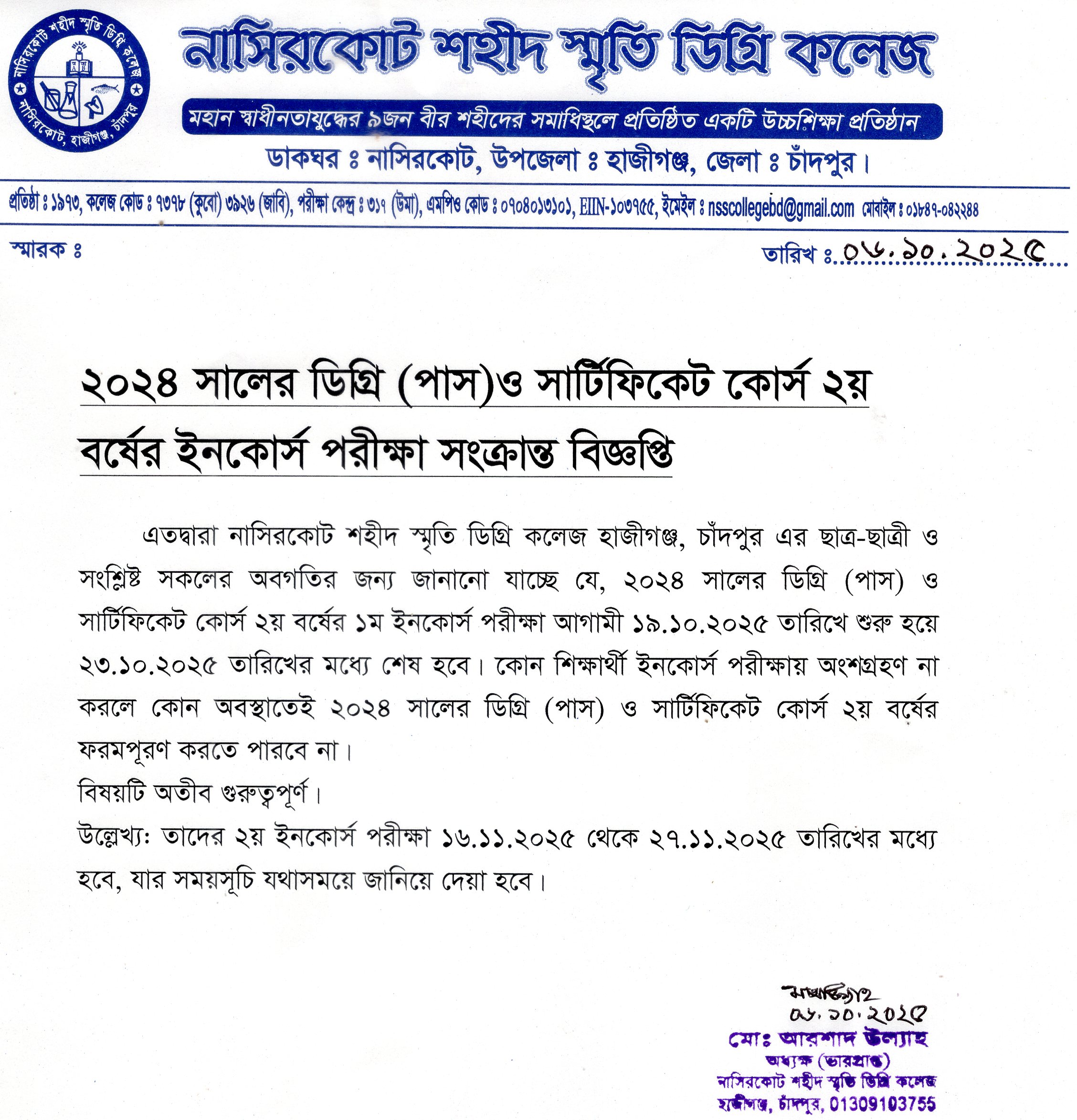 ২০২৪ সালের ডিগ্রি ( পাস) ও সার্টিফিকেট কোর্স ২য় বর্ষের ইনকোর্স পরীক্ষা সংক্রান্ত বিজ্ঞপ্তি।